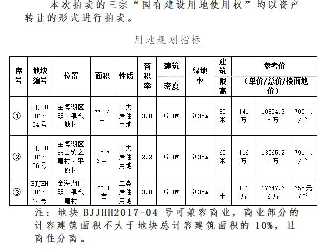 1、規(guī)劃:①號(hào)地塊77.16畝,容積率3.0,起拍價(jià)141萬(wàn)元/畝;②號(hào)地塊112.76畝,容積率2.2,,起拍價(jià)116萬(wàn)元/畝;③號(hào)地塊135.41畝,容積率3.0,起拍價(jià)131萬(wàn)元/畝;成交之日起三個(gè)月內(nèi)支付成交款80%,余款六個(gè)月內(nèi)付清。